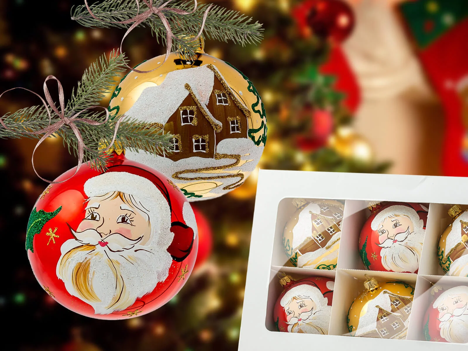 Chatki Mikołaj i ostrokrzew na złotym błysku -  100 mm bombki choinkowe szklane 6 szt