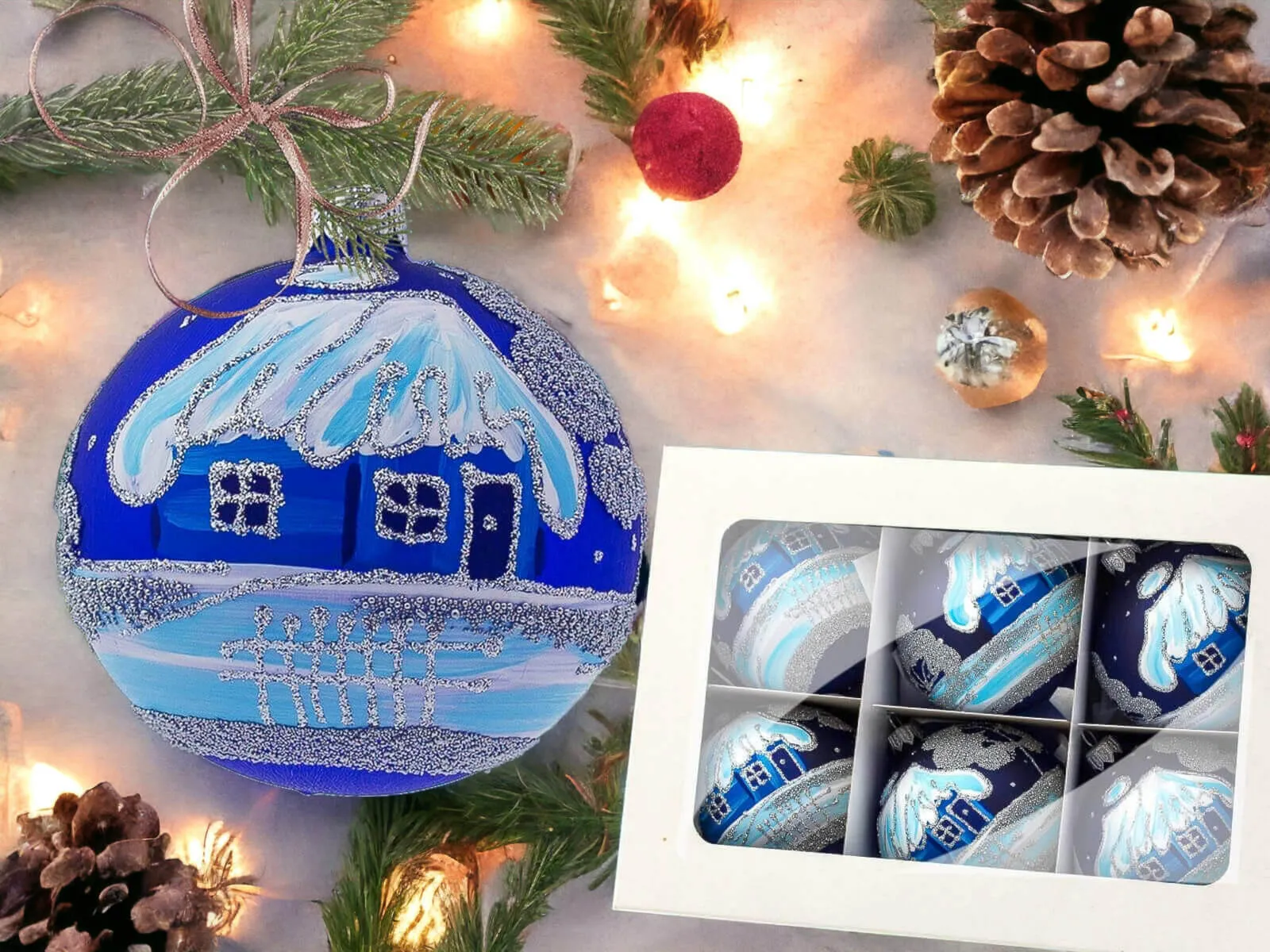 Srebrne chatki na granacie -  80 mm  bombki choinkowe szklane 6 szt