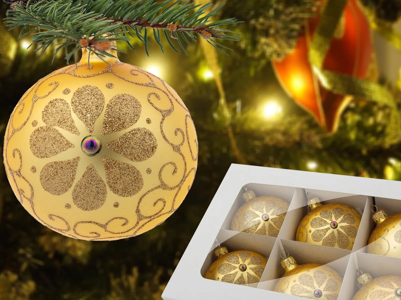 Bombki złoty kwiatek na złotym - 80 mm bombki choinkowe szklane 6 szt