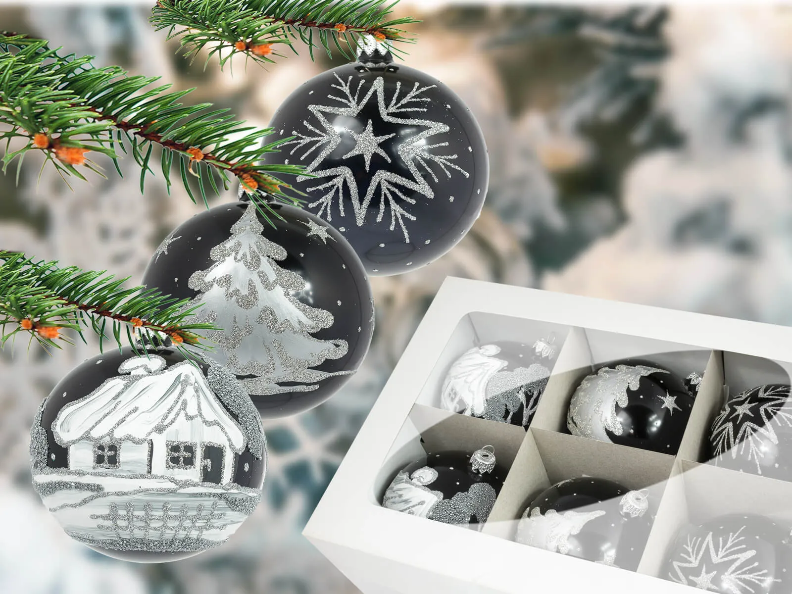 Bombki czarny opal - srebrna chatka gwiazdka choinka - 100 mm bombki choinkowe szklane 6 szt