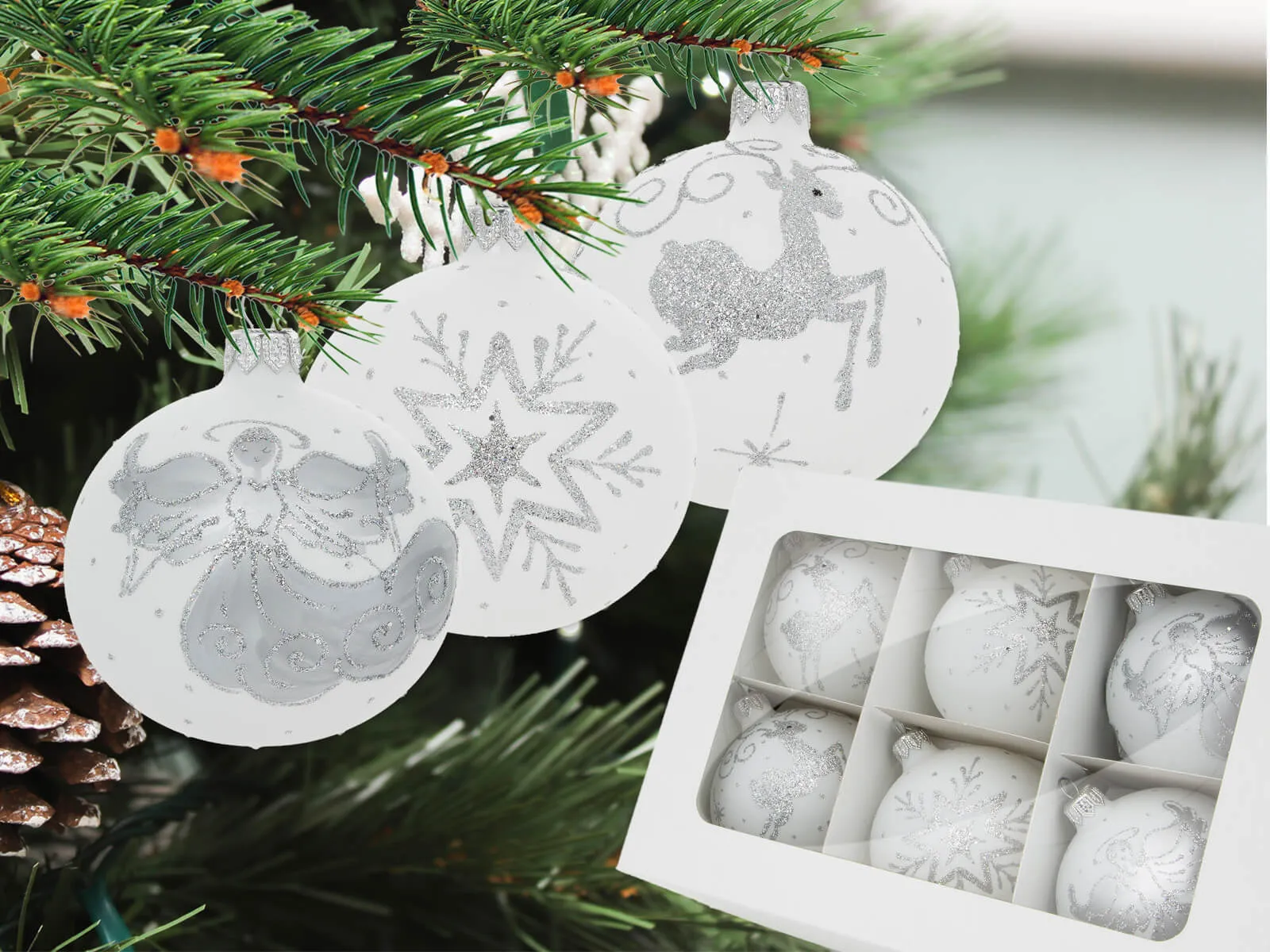 Bombki srebrny mix - jelonki śnieg biały aniołek - 80 mm bombki choinkowe szklane 6 szt