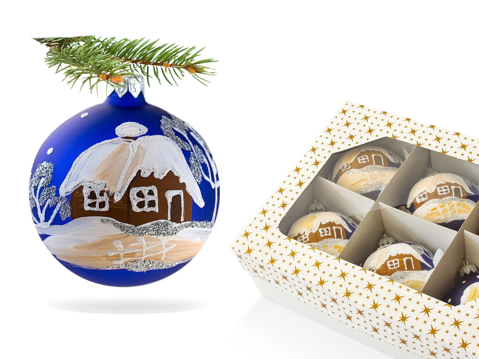 Bombki chatki na niebieskim - 80 mm bombki choinkowe szklane 6 szt