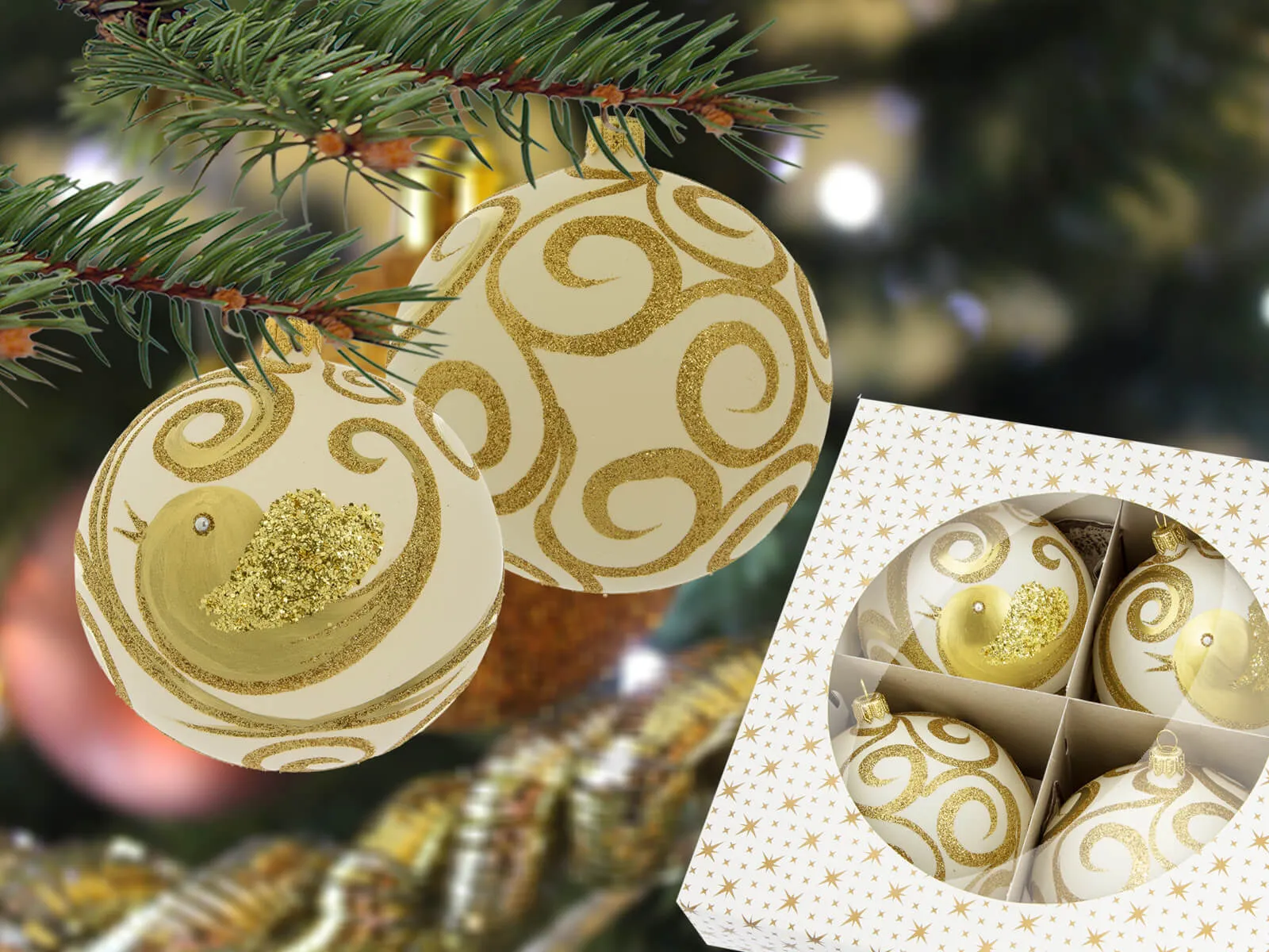Bombki złoty ptaszek na ecru -  100 mm bombki choinkowe szklane 4 szt