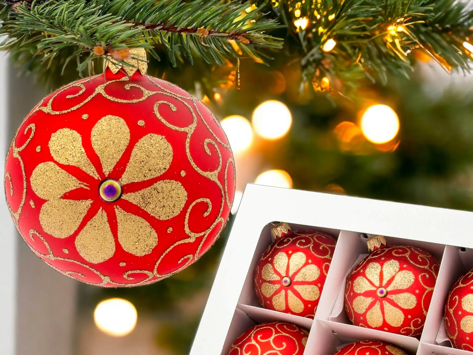 Bombki złoty kwiatek na czerwonym - 80 mm bombki choinkowe szklane 6 szt