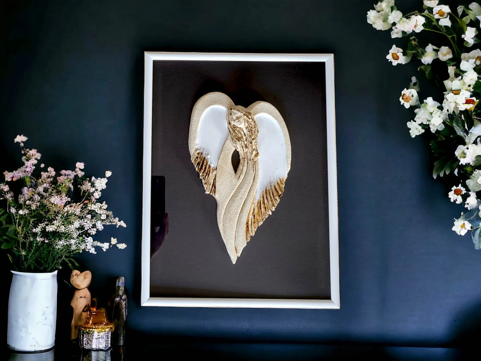 Anioł z Sercem - biały - 35 x 15 cm figurka dekoracyjna gipsowa