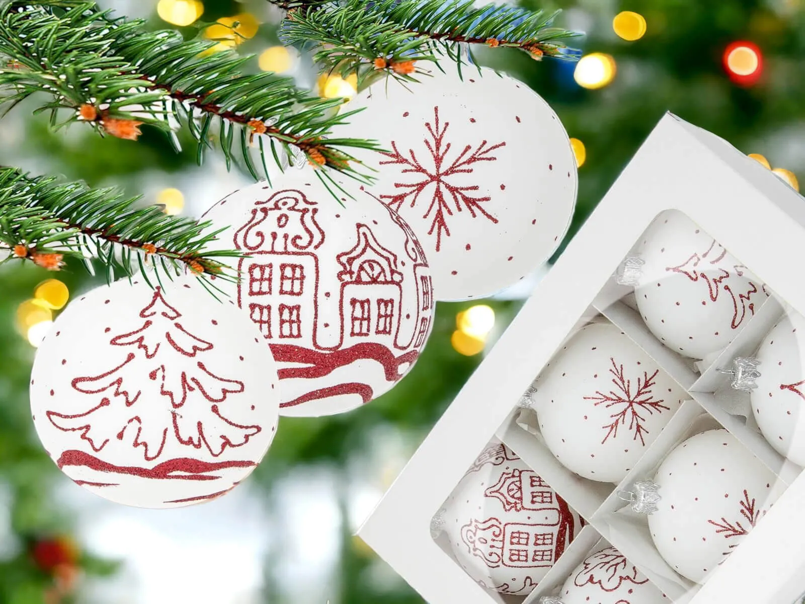 Bombki czerwony brokat na kredzie - chatki gwiazdka choinka - 80 mm bombki choinkowe szklane 6 szt