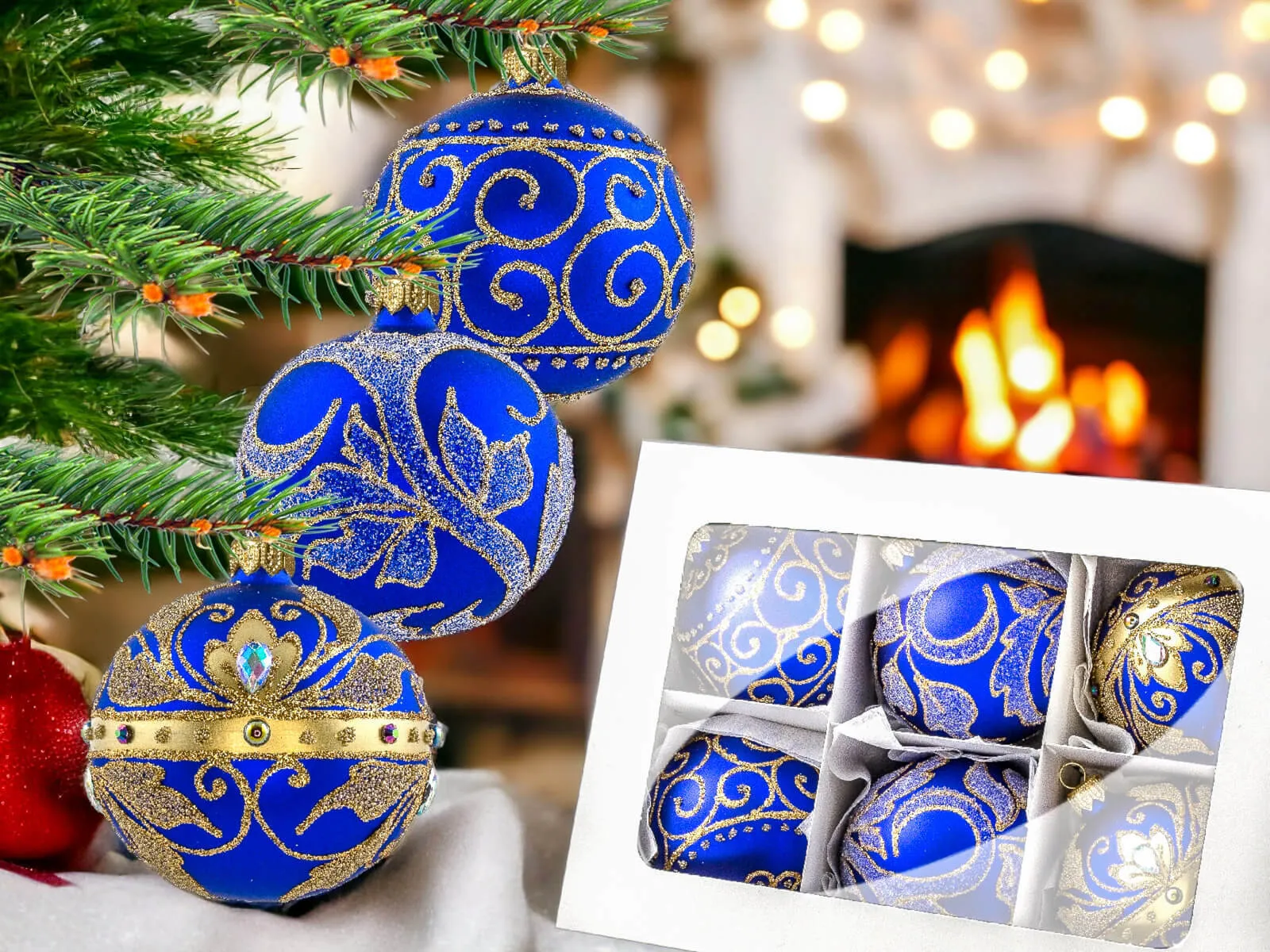 Bombki złoty mix Królewski szafirowy - 80 mm bombki choinkowe szklane 6 szt