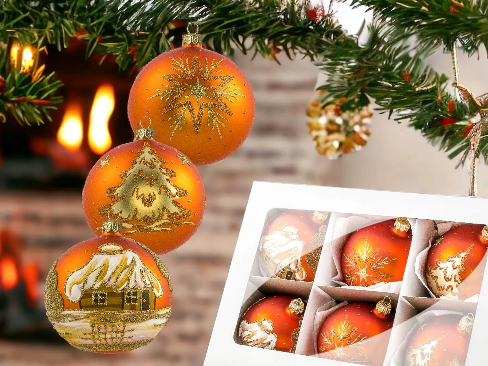 Bombki złote chatki gwiazdki choinka na pomarańczu -  100 mm bombki choinkowe szklane 6 szt