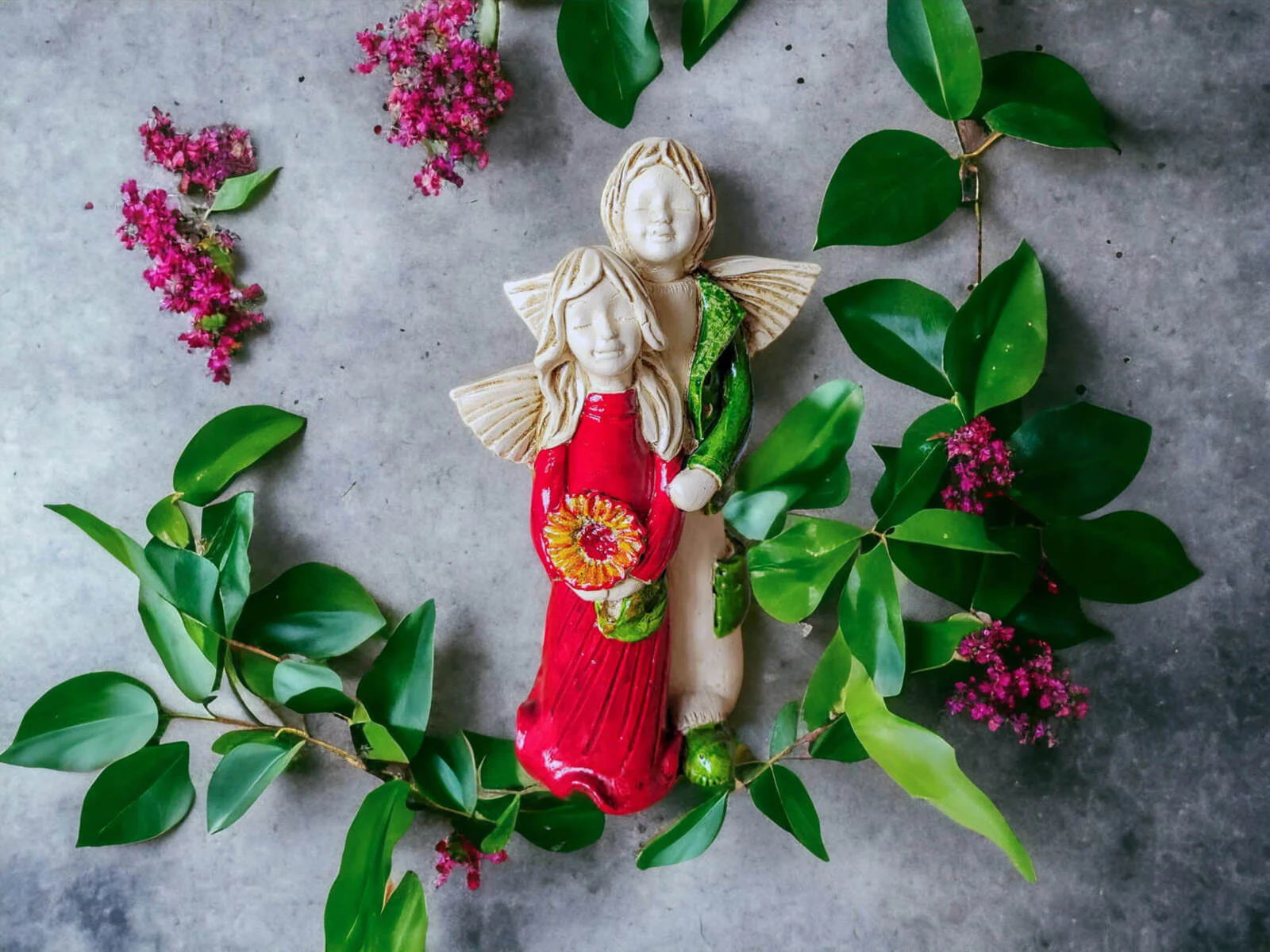 Anioł Allen & Alice - czerwony zielony - 25 x 14 cm figurka dekoracyjna gipsowa