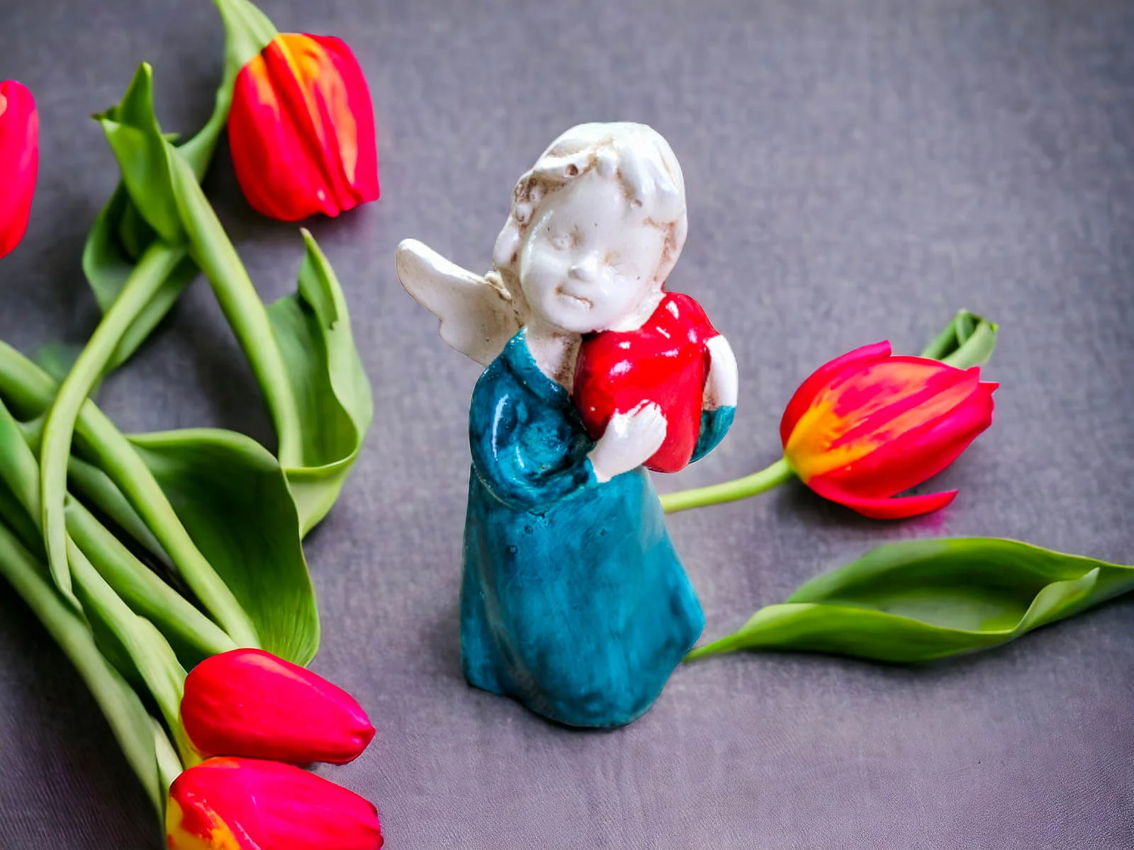 Aniołek z sercem - turkus -  15 x 7.5 cm figurka dekoracyjna gipsowa