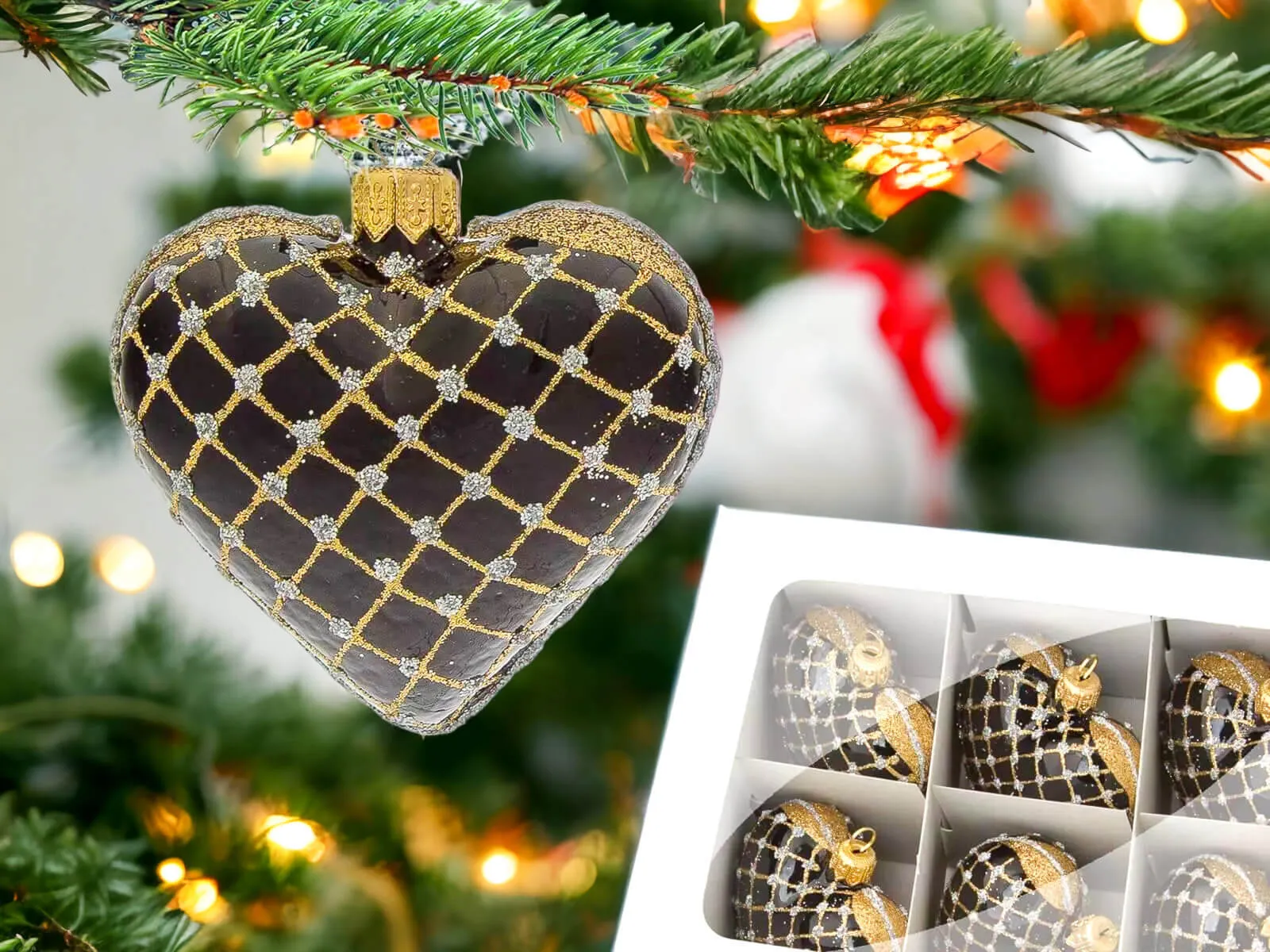 Bombki serca czarno złote - 8 x 7 cm bombki choinkowe szklane 6 szt
