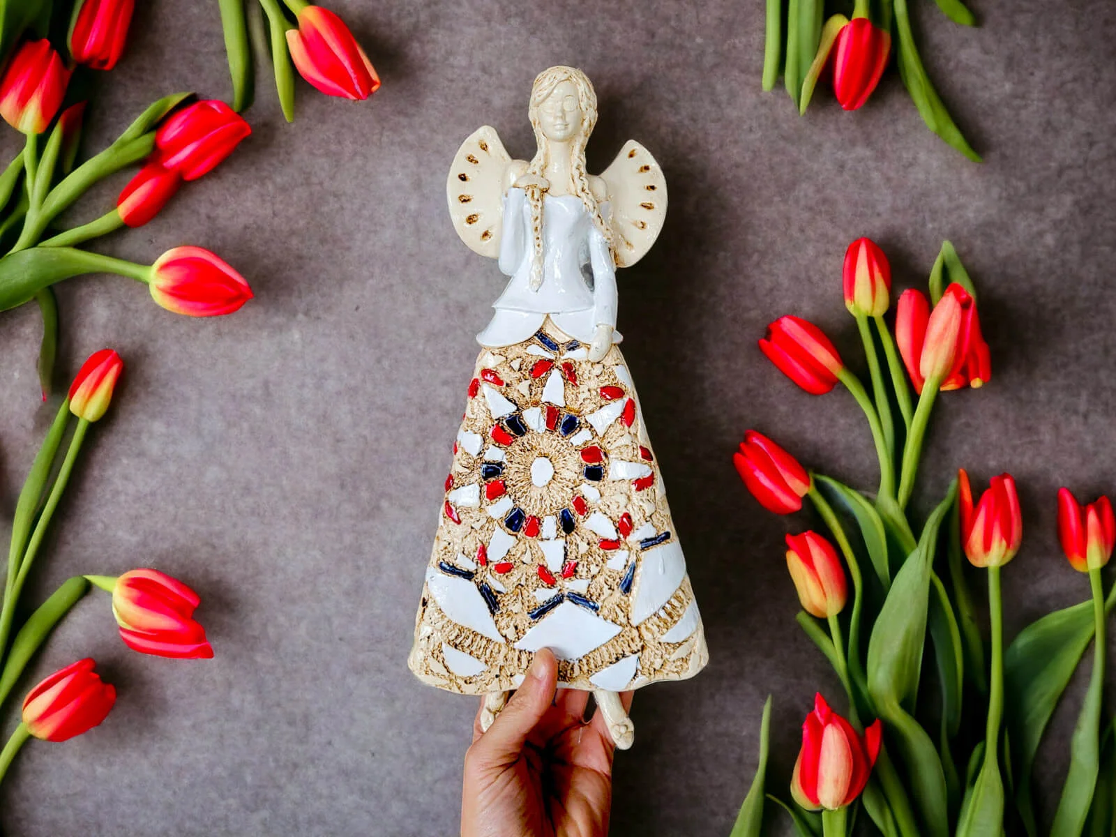Anioł Heather - biały czerwony  -  35 x 15 cm figurka dekoracyjna gipsowa