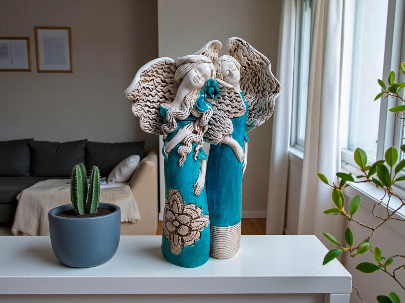 Dwa Turkusowe Anioły - komplet - figurka dekoracyjna gipsowa