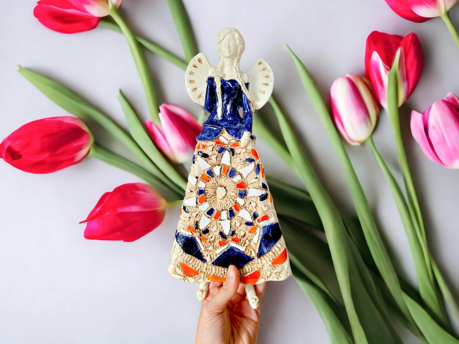 Anioł Heather - granat biały czerwony -  35 x 15 cm figurka dekoracyjna gipsowa