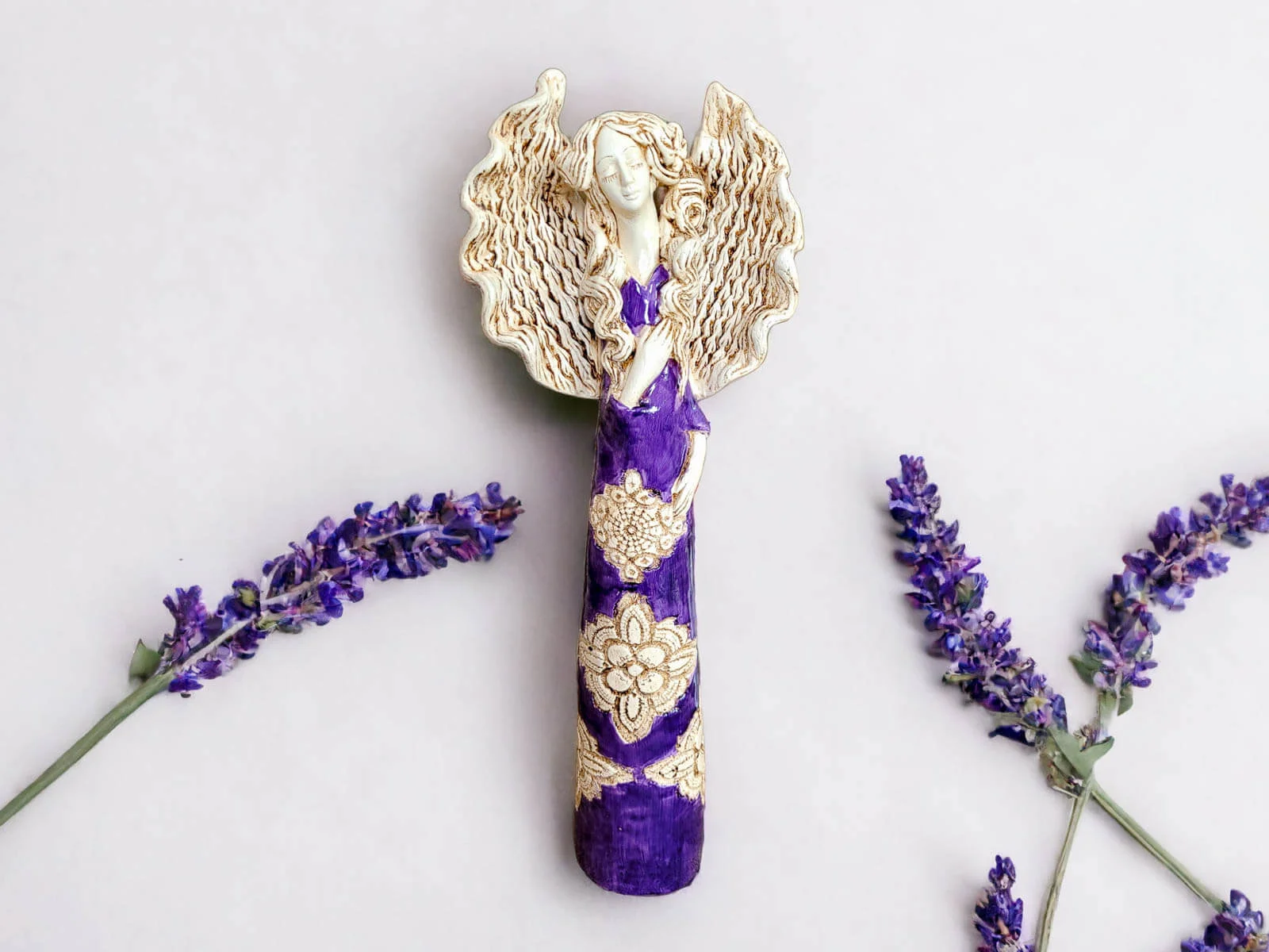 Anioł Madelyn - fiolet - 47 x 18 cm figurka dekoracyjna gipsowa