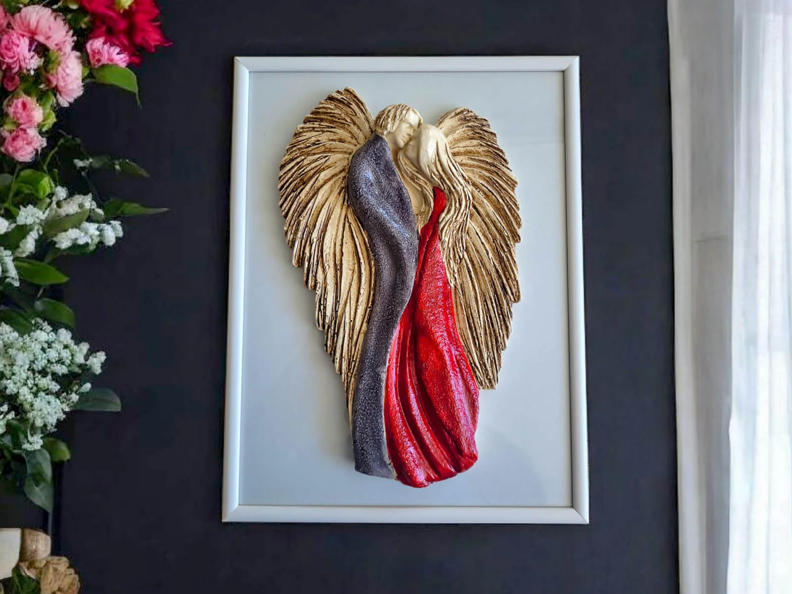 Zakochane Anioły + ramka - wiszące czerwone - 35 x 21 cm figurka dekoracyjna gipsowa