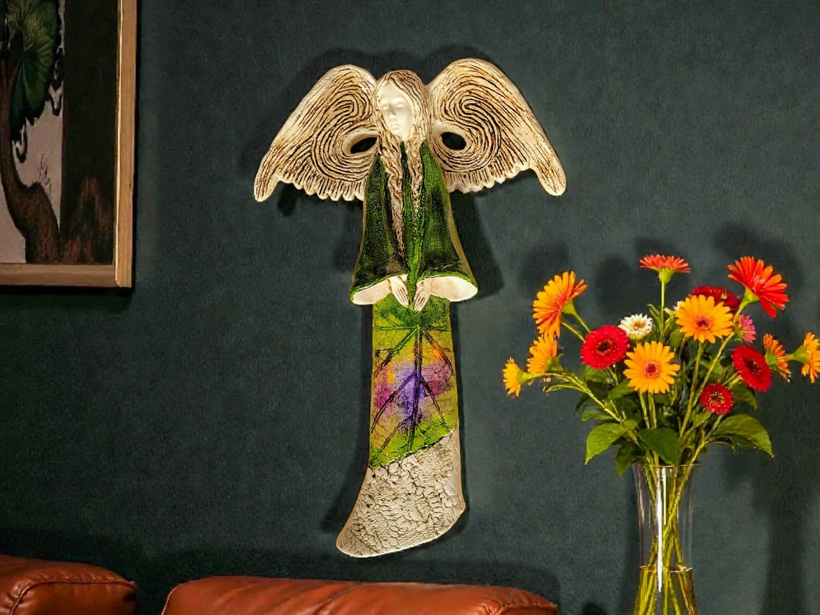 Anioł Clara Art Leaf - zielony -  40 x 28 cm figurka dekoracyjna gipsowa