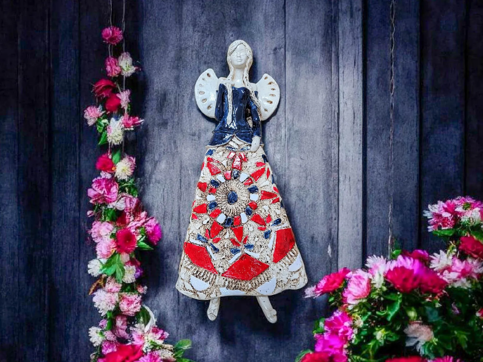 Anioł Heather - granat biały czerwony -  35 x 15 cm figurka dekoracyjna gipsowa