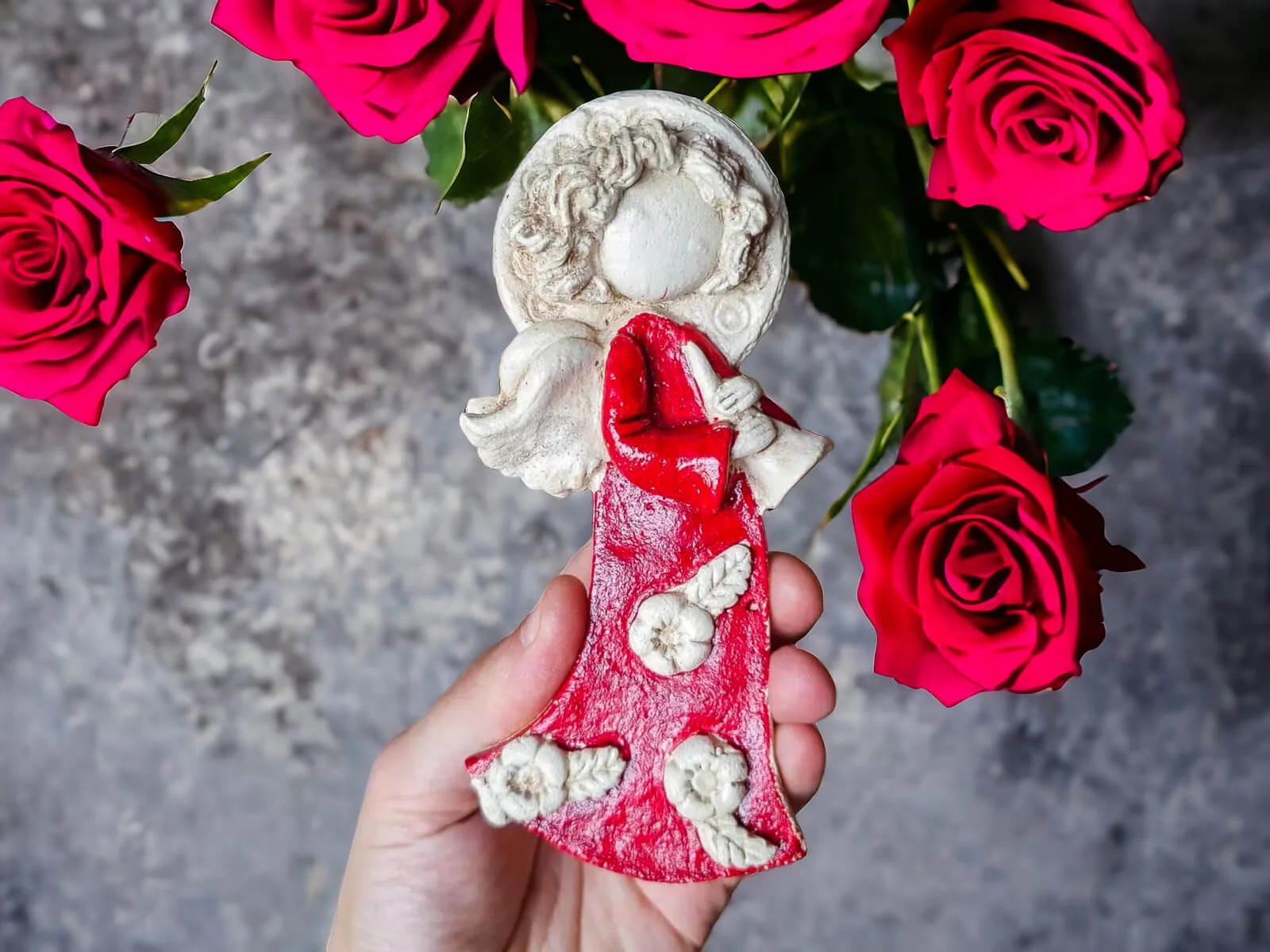 Anioł Xenylla + ramka - czerwony -  figurka dekoracyjna gipsowa 31 x 16 cm